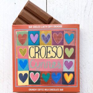 The bespoke design certainly does not disappoint, with a quaint and quirky Welsh village scene with several figures all out walking dogs of various shapes and sizes. The slogan is “Am caro I, cared fy nghi” (love me, love my dog). Perfect for dog lovers and chocolate lovers alike!